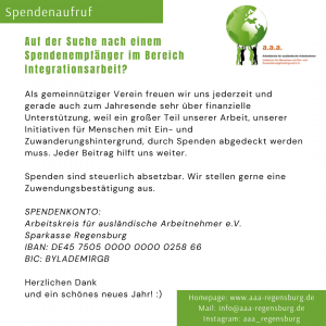 Als gemeinnütziger Verein ist der a.a.a. mit “alten und neuen” Projekten auf finanzielle Unterstützung angewiesen. Gerade zum Jahresende freuen wir uns über Spenden!! Jede Spende hilft!
